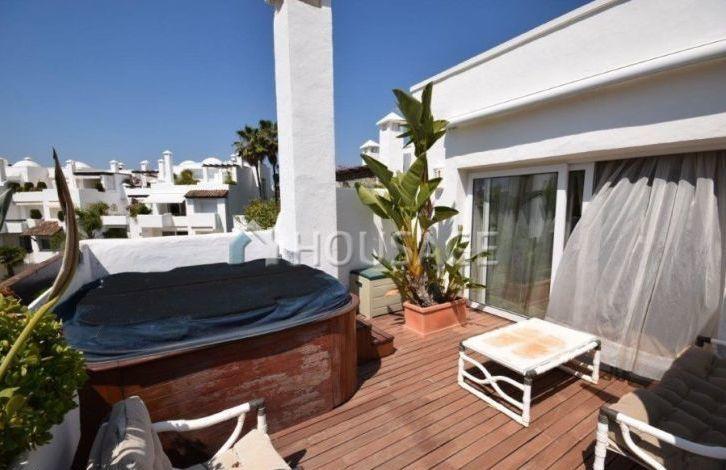 Красивый двухэтажный пентхаус в одном из самых востребованных жилых комплексов Марбельи на Золотой Миле. Комплекс расположен рядом с отелем Дон Пепе и в нескольких минутах ходьбы от Пасео Маритимо и центра Марбельи. Прекрасный тропический сад с бассейном и охраной 24 часа в сутки. Пентхаус компромиссы прихожая, гостиная/столовая с выходом на солнечную террасу с видом на сад, полностью оборудованная открытая кухня американского типа, 2 спальни и 2 ванные комнаты, одна из них с ванной. На верхнем уровне находится главная спальня с ванной комнатой и большая терраса с ориентацией на юго-запад и джакузи, а также терраса с северной ориентацией. Отдельное, большое подсобное помещение. Пентхаус был полностью отремонтирован и оснащен всем с деревянным полом.