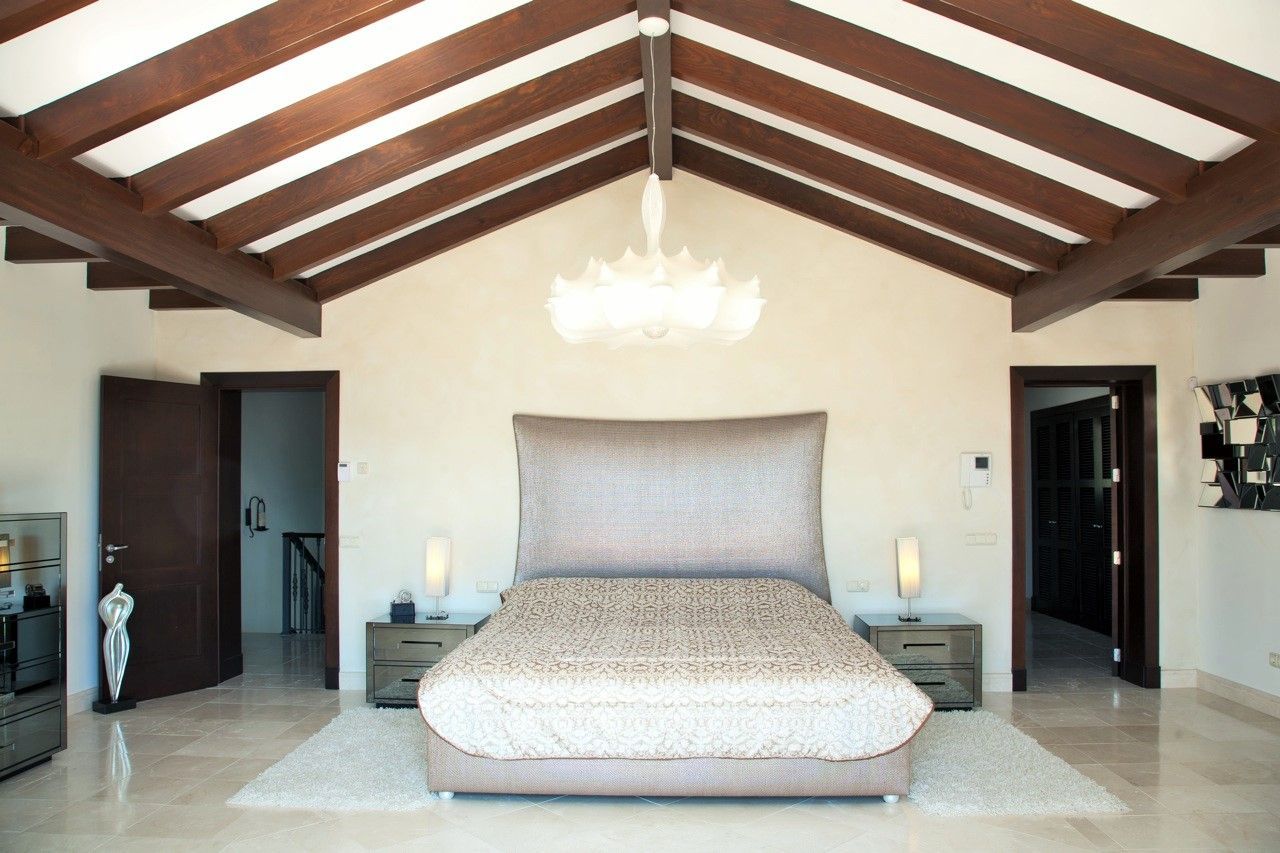 На верхнем этаже дома расположена спальня для гостей с гардеробной и хозяйская спальня с камином, гардеробной, отделанной мрамором ванной комнатой и просторной солнечной террасой с видом на горы и сад.