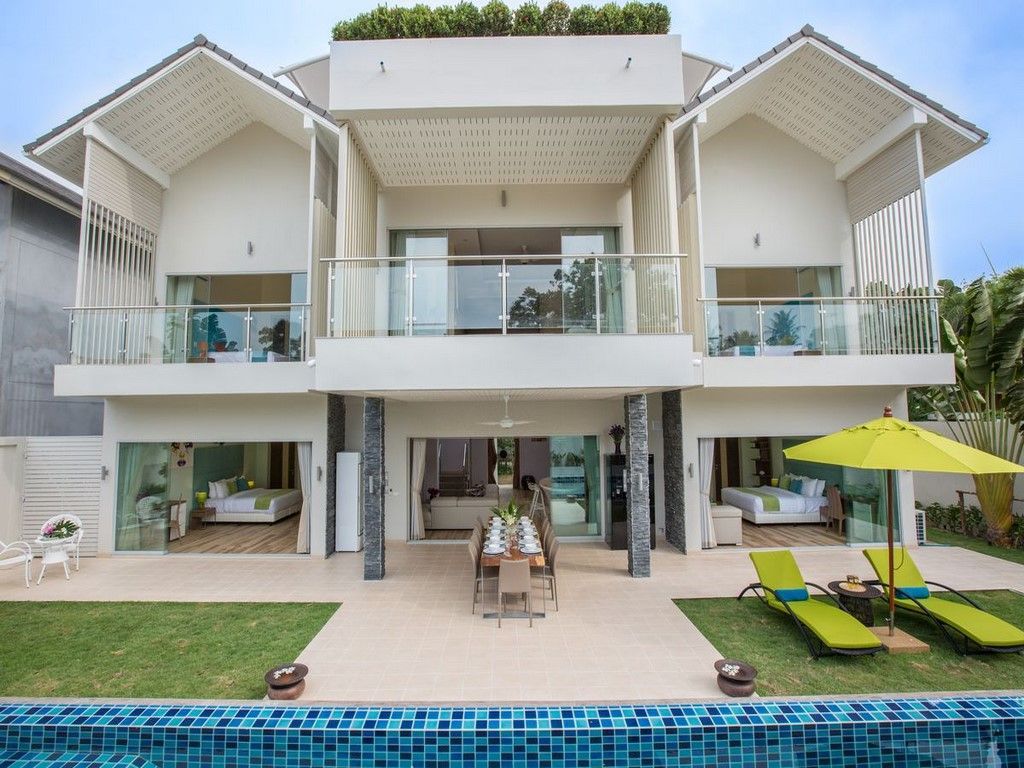 Общее описание. Эта комплекс вилл, построенный на одной территории с общим ресепшеном, детской площадкой, охраной и управляющей фирмой. При этом каждая вилла имеет собственную огороженную территорию. Есть несколько вариантов Вилл с разным количеством спальных комнат. Для вашего внимания стильная и элегантная вилла на 5 спален. Она особенно заинтересует тех, кто хочет иметь дом у моря как для семейного отдыха, так и для получения стабильного дохода от сдачи в аренду.Совершенно новая вилла, меблированная и оборудованная по самым высоким стандартам, полностью готова к заселению и удовлетворит запросы самых взыскательных клиентов.Для обеспечения высокого качества дома, все строительные и отделочные работы велись только квалифицированными рабочими из Европы. Район. Вилла расположена в одном из тихих и красивых мест на Самуи, район Бантай. Есть не большой, но красивый пляж с белым песком, живописной скалой и лазурным морем, можно плавать с маской. Бантай немного удален от основной жизни острова, до баров, ночной жизни, супермаркетов вам придется ехать на машине или байке 20-30 минут. Зато вокруг тихо и спокойно. На побережье Бантай ряд очень хороших ресторанов, которые подают свежие морепродукты. Расположение. Вилла построена на плоском участке не далеко от моря. Море в 300 метрах, но идти придется немного в обход, прямой дороги нет. Море в пешей доступности 600-700 метров, идти 10 минут. Ухоженная зеленая территория, хорошая бетонная дорога. Планировка. Уровни. Проект виллы был тщательно продуман с целью оптимального использования пространства и создания достаточного количества и общественных, и приватных зон. Первый уровень. (243,3 м. кв.)На первом этаже расположена зона гостиной открытого плана с полностью оборудованной современной кухней . Благодаря безрамным, полностью сдвигающимся дверям от потолка до пола, выходящим на террасу у бассейна, практически отсутствует граница между внутренним и внешним пространством. Зона столовой с огромным обеденным столом на 12 особ расположена на террасе под крышей, примыкающей к гостиной и воспринимается как её продолжение .Так же на первом уровне находятся 2 одинаковые по размеру спальни (25 м2) с выходом на террасу у бассейна. Центральное место просторного внутреннего двора виллы занимает большой бассейн 12x4,4 м c мелкой детской зоной, огороженной от основной зоны бассейна подводной перегородкой. Второй уровень. (243,3 м. кв.) На втором этаже расположены ещё 3 спальни. Каждая из 5 просторных спален виллы оборудованы и декорированы по стандартам номера Делюкс отеля 5*. Во всех спальнях есть приватная терраса (14 м2) с видом на бассейн и комфортной ротанговой мебелью, большая ванная комната, гардеробная, широкие кровати размера extraking-size c ортопедическими матрасами, письменный стол, телевизор. Благодаря высоким потолкам спальни наполнены светом и воздухом. Третий уровень. (82,2 м. кв.) На третьем этаже расположена просторная лаунж зона -большая терраса под крышей. Она многофункциональна и может быть использована как комфортабельное место отдыха или как площадка для занятий йогой. Терраса оборудована удобной мягкой мебелью, барной стойкой и проектором с экраном и современной звуковой системой. Вечером эта зона превращается в кинотеатр под звездами.