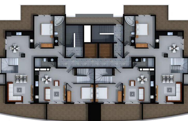 Квартиры 2+1 трехсторонние с направлениями Восток-Юг-Запад и Восток-Север-Запад, 22 квартиры 1+1 с видом на горы – Восточное направление и 20 квартир 1+1 с видом на море – Юго-Западное направление.