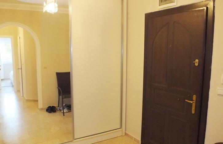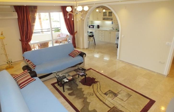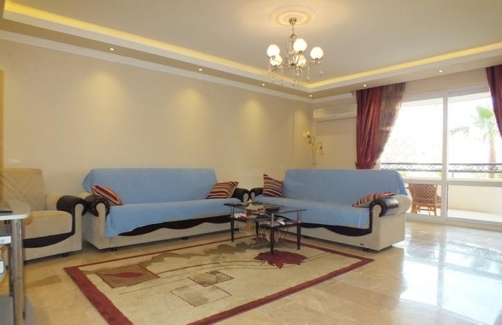 Эта просторная квартира находится на 1 этаже 11 этажного дома, общая площадь составляет 120 м2 : 2 спальни, 2 ванные, 1 гостевой туалет, 2 панорамных балкона, гостиная с кухней открытого плана, в каждой комнате установлен кондиционер.Окна квартиры смотрят на юго-восточную сторону и юго-западную благодаря чему в квартире всегда много солнечного света.