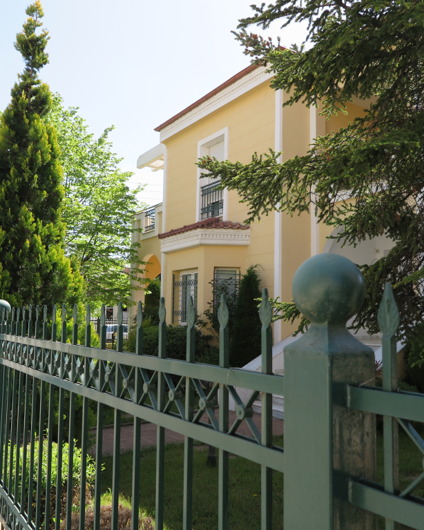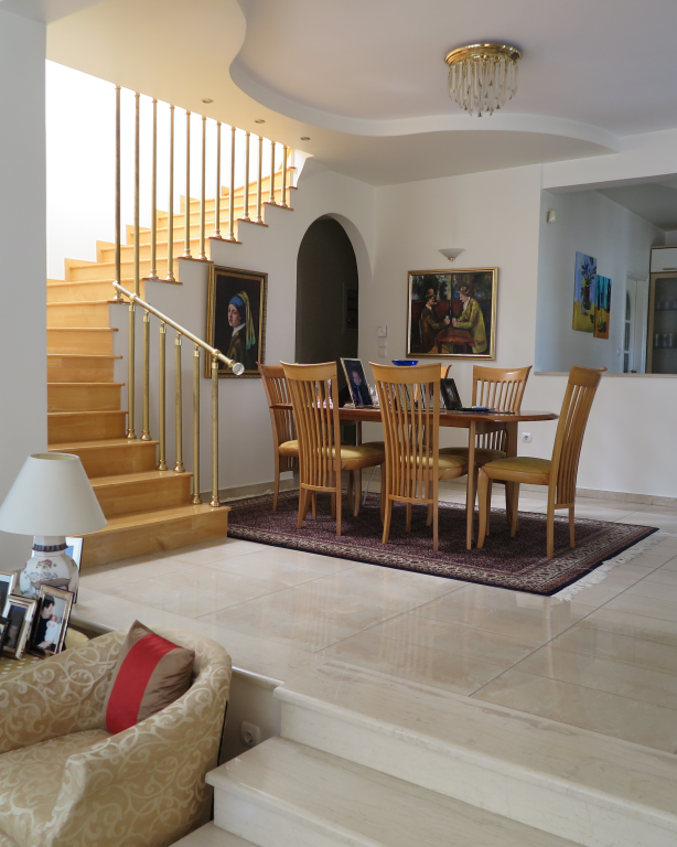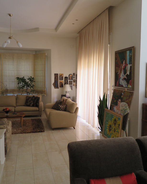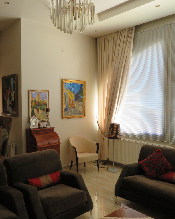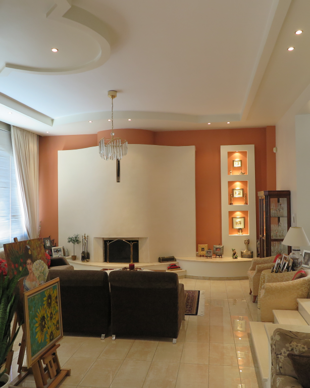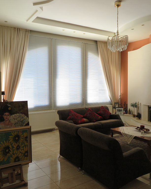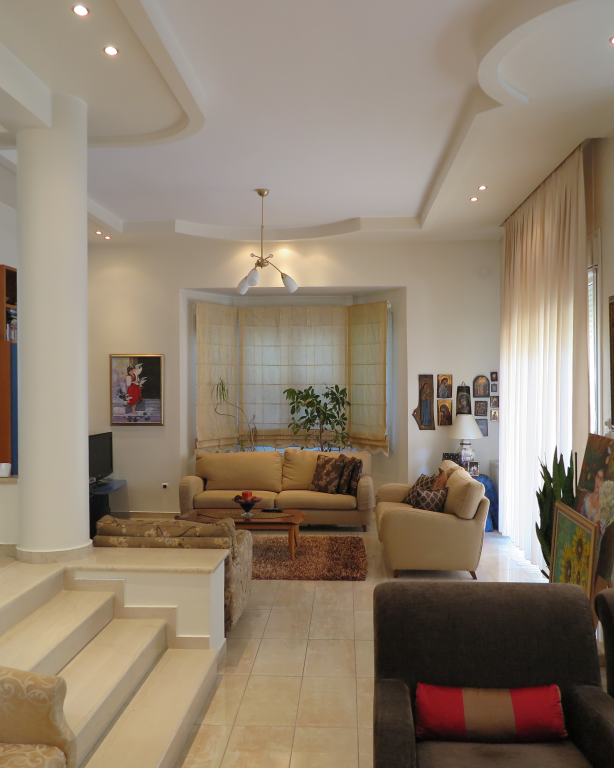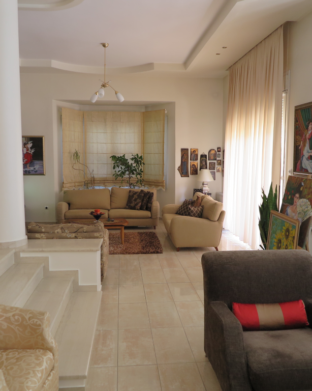 Вилла роскошного строительства и специальной архитектуры. Это уникальное свойство, построенное из качественных материалов как внутри, так и снаружи. Он состоит из 2-х этажного подвального помещения площадью 45 квадратных метров. Первый этаж 150 квадратных метров состоит из современной кухни, просторной столовой, светлой большой гостиной, гостевой дом с отдельным выходом в сад, туалет с душем и 2 складские помещения. На первом этаже есть гараж на 2 места с внутренней связью с основной зоной и складское помещение. На первом этаже 120 кв.м. есть 3 спальни, одна из которых имеет свой туалет с душевой кабиной, а также большую ванную комнату с гидромассажем, которая обслуживает другие комнаты. Также есть рабочий зал с сушилкой, гладильной доской и большим шкафом. Во всех номерах есть высококачественные шкафы итальянского происхождения. На 1-м этаже есть 2 балкона и прекрасная терраса площадью 85 кв.м. Входная дверь - это система безопасности и изоляционные рамы DORAL, также имеется камин со специальным дизайном и отопительной системой с двумя вариантами (центральное отопление, масло), трехэнергетический котел с солнечным коллектором, сигнализация, домофонный монитор и инфраструктура замкнутого контура. этаж первого этажа - керамический гранит, а лестница и 1-й этаж натурального дерева. В подвале есть котельная в независимом пространстве, большие шкафы и столы для хранения. Сад очень внимателен травы и деревьев, а также декоративных растений с автоматизированной системой полива. Корпус имеет сверхпрочную конструкцию с 14-сантиметровыми железными и садовыми и электрическими гаражными дверями с дистанционным управлением.